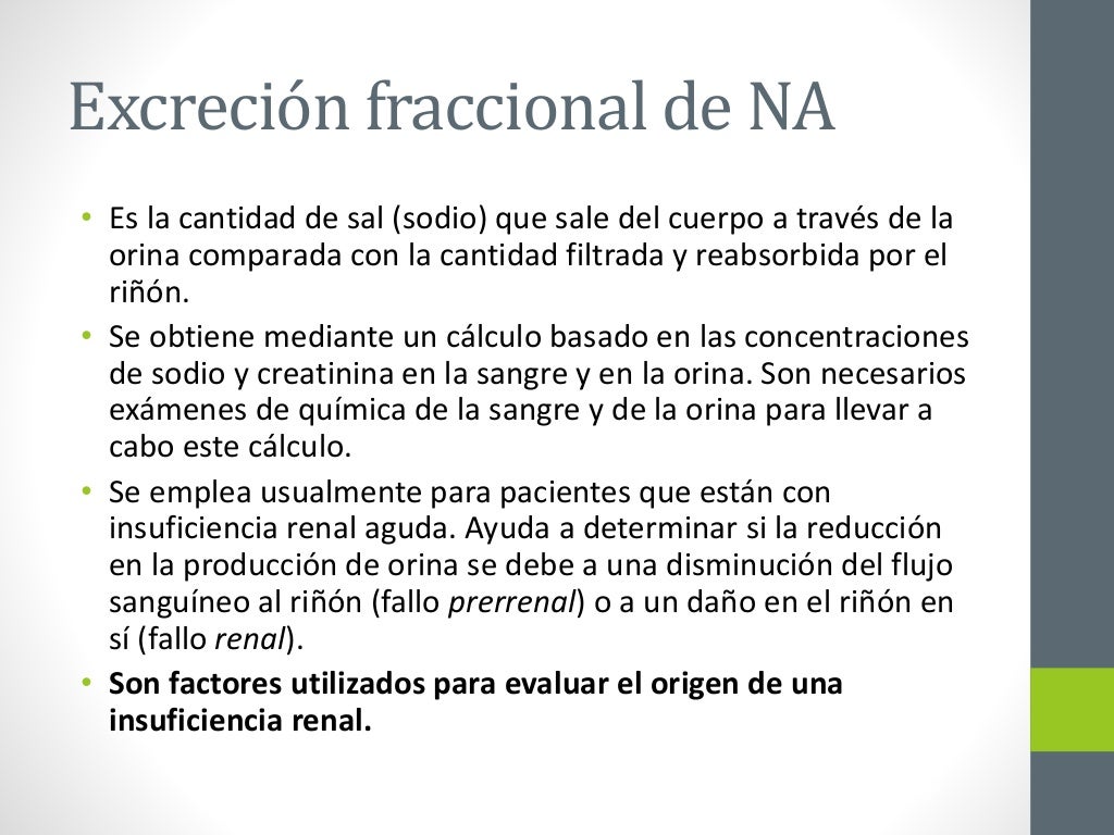 Excreción fraccional de sodio EFNa Diccionario médico. La excreción fraccional de sodio puede ser calculada en una muestra de orina aislada mediante. Para este cálculo la concentración de creatinina en orina Cr orina se introduce como mcmolL de forma predeterminada. La excreción fraccional de sodio también excreción de sodio fraccionada o FENa es la cantidad de sal sodio que sale del cuerpo a través de la orina comparada con la cantidad filtrada y reabsorbida por el riñón.